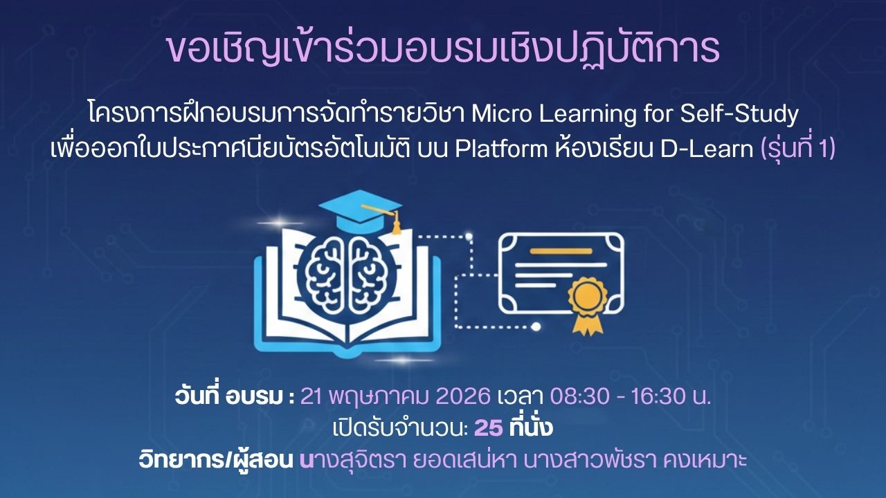 โครงการฝึกอบรมการจัดทำรายวิชา Micro Learning for Self-Study เพื่อออกใบประกาศนียบัตรอัตโนมัติ บน Platform ห้องเรียน D-Learn (รุ่นที่ 1)