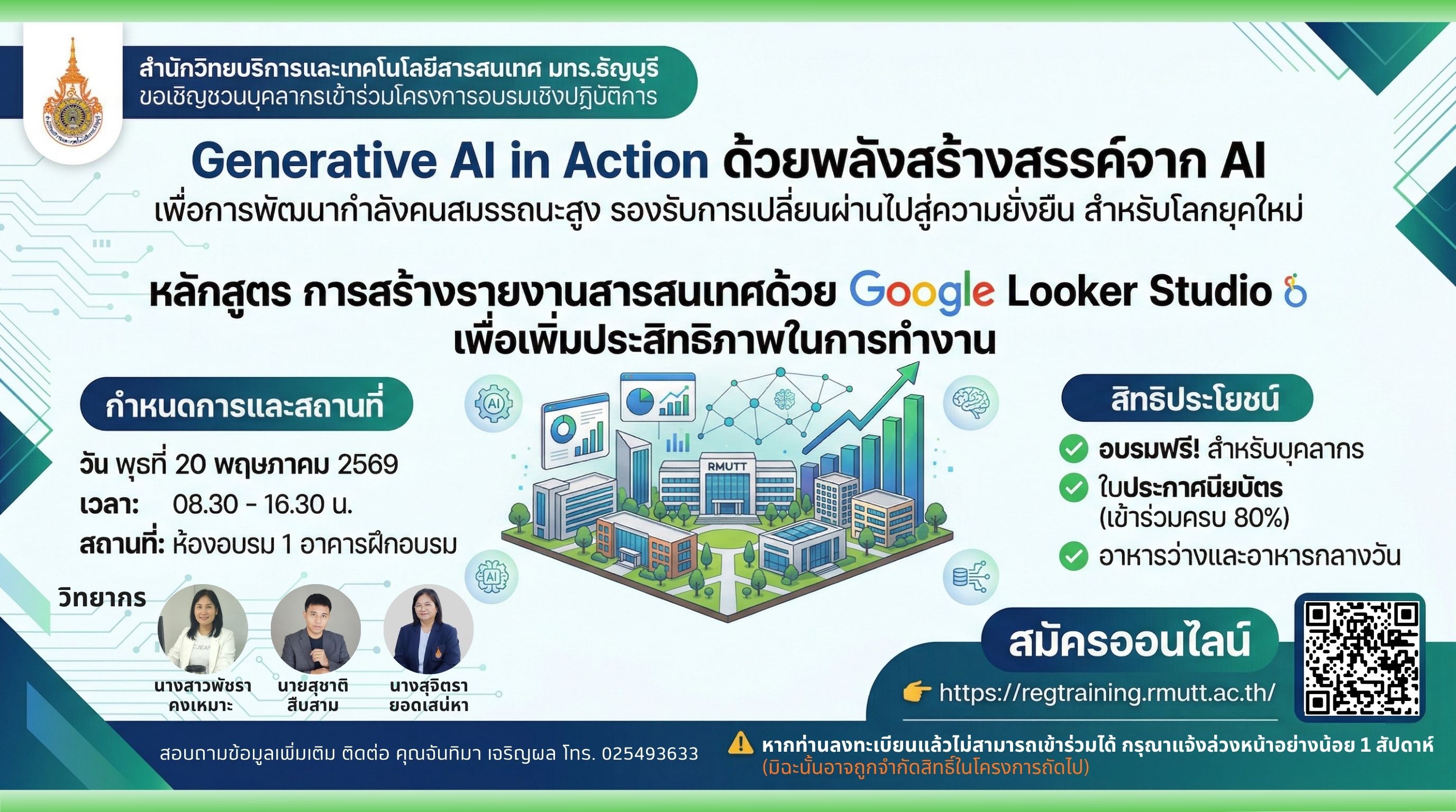 วันที่อบรม : 21 พฤษภาคม 2569 เวลา 08:30 - 16:30 น. เปิดลงทะเบียน : 19 กุมภาพันธ์ 2569 - 7 พฤษภาคม 2569 เวลา 08:30-16:30 น. สำหรับ : อาจารย์และเจ้าหน้าที่ ค่าสมัคร : ฟรี สถานที่ : ห้องอบรม 1 ชั้น 2 อาคารฝึกอบรม สำนักวิทยบริการและเทคโนโลยีสารสนเทศ มทร.ธัญบุรี จำนวนที่เปิดรับ 25 ที่นั่งจำนวนที่นั่งเต็มแล้ว ไม่สามารถลงทะเบียนได้
