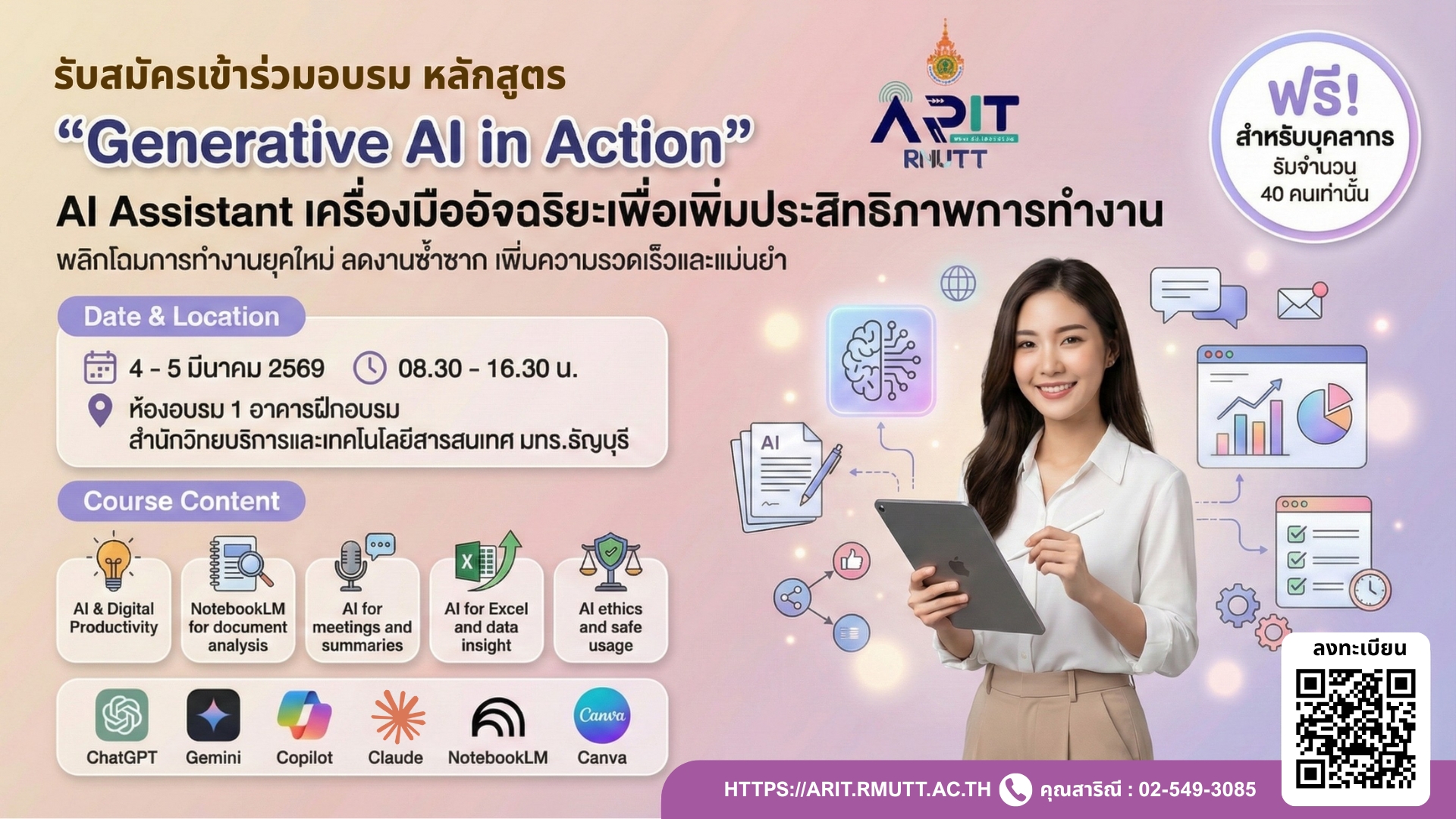 0512603001 หลักสูตร Generative AI Assistant เครื่องมืออัจฉริยะเพื่อเพิ่มประสิทธิภาพการทำงาน วันที่ 4 - 5 มีนาคม 2569